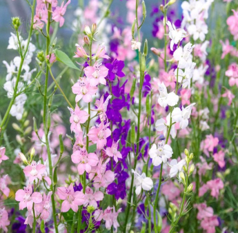“Blossoming in pink, blue, and white, these colorful spikes will bedazzle the eye. Larkspur is a favorite flower for many annual flower gardens and makes a beautiful cut flower as well. Hummingbirds love to visit this plant too.This close cousin of the delphinium has a similar appearance to that flower, but grows as an annual. The genus name Delphinium comes from a Greek word meaning dolphin, referring to the unique shape of the blossoms; the species name “ajacis” comes from the Greek myth that these flowers first grew in the place where the great warrior Ajax committed suicide. The common name of Delphinium ajacis, larkspur, comes from the supposed resemblance of the blossoms to the claw of a lark. Native Americans and early settlers used the bright flowers of this plant to make blue ink. Larkspur is the flower of the month of July, and symbolizes a carefree or fickle heart.” Everwilde