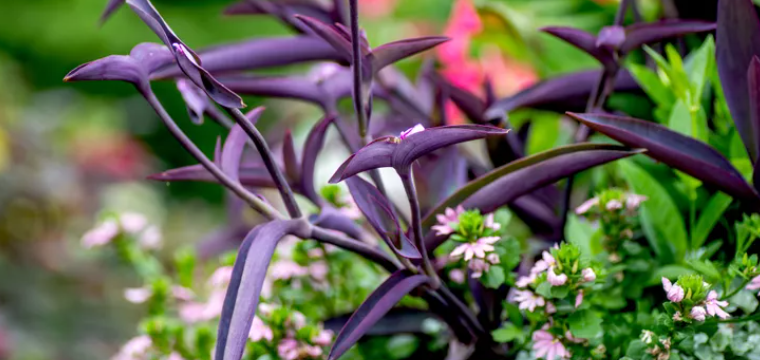 “Most varieties of purple heart plant are virtually indestructible with long, trailing stems. This creeping plant grows to 18 inches tall and 12 inches wide with stems that tend to flop. The leaves are oval and deep purple with tiny pink flowers in summer. In winter, frost may kill tops of purple heart plants making them generally unattractive, but recovery is fast in warm weather. Use as ground cover, for bedding, or in pots. Plant them in full sun or light shade. The more sun they get, the darker the purple color will be. Cuttings of purple heart plant root quickly, which makes them a cinch to propagate in a glass of water. Deer don’t normally browse these plants.” Southern Living